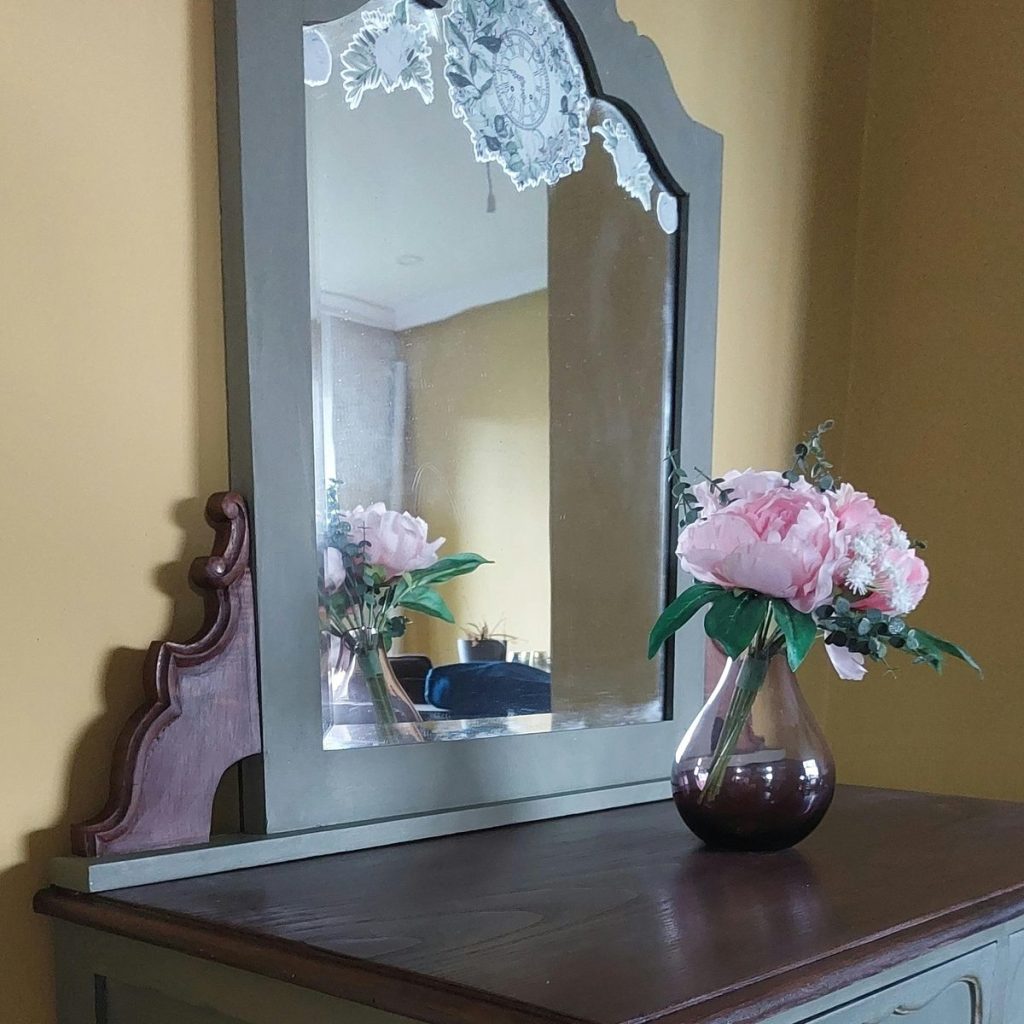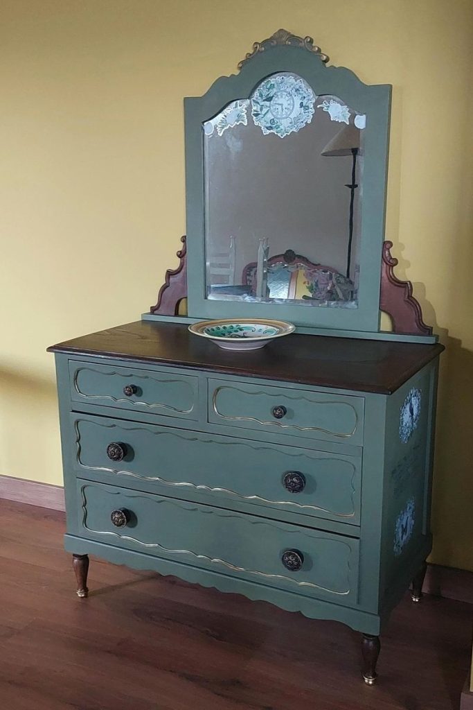 Esta hermosa cómoda ha sido transformada con mucho amor y chalk paint para darle un toque fresco y elegante. Con transferencias, detalles dorados y un acabado verde oliva que resalta su encanto vintage.