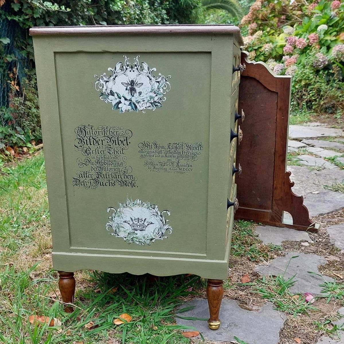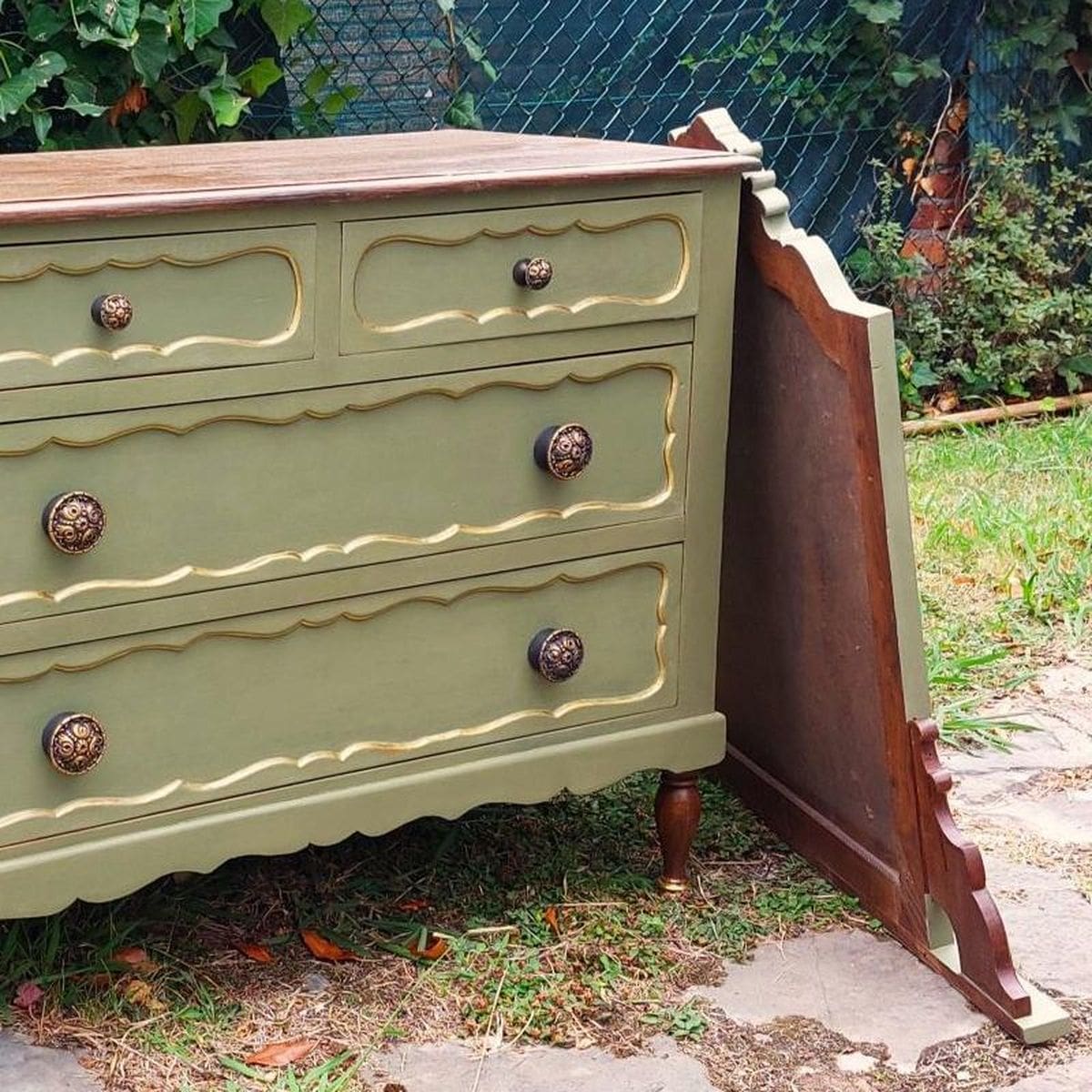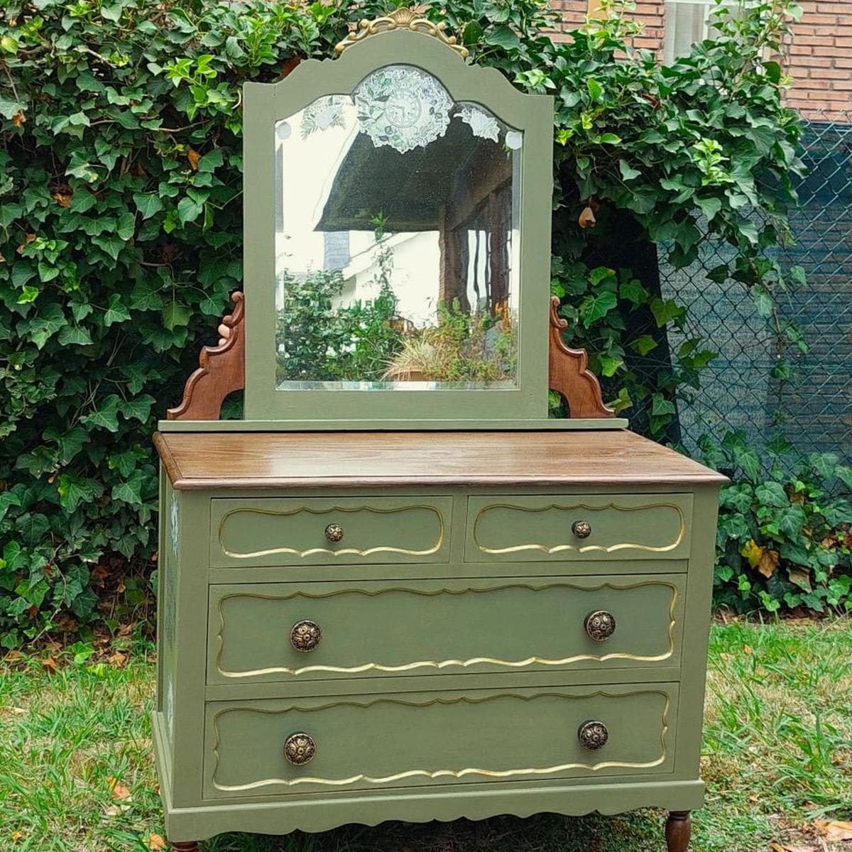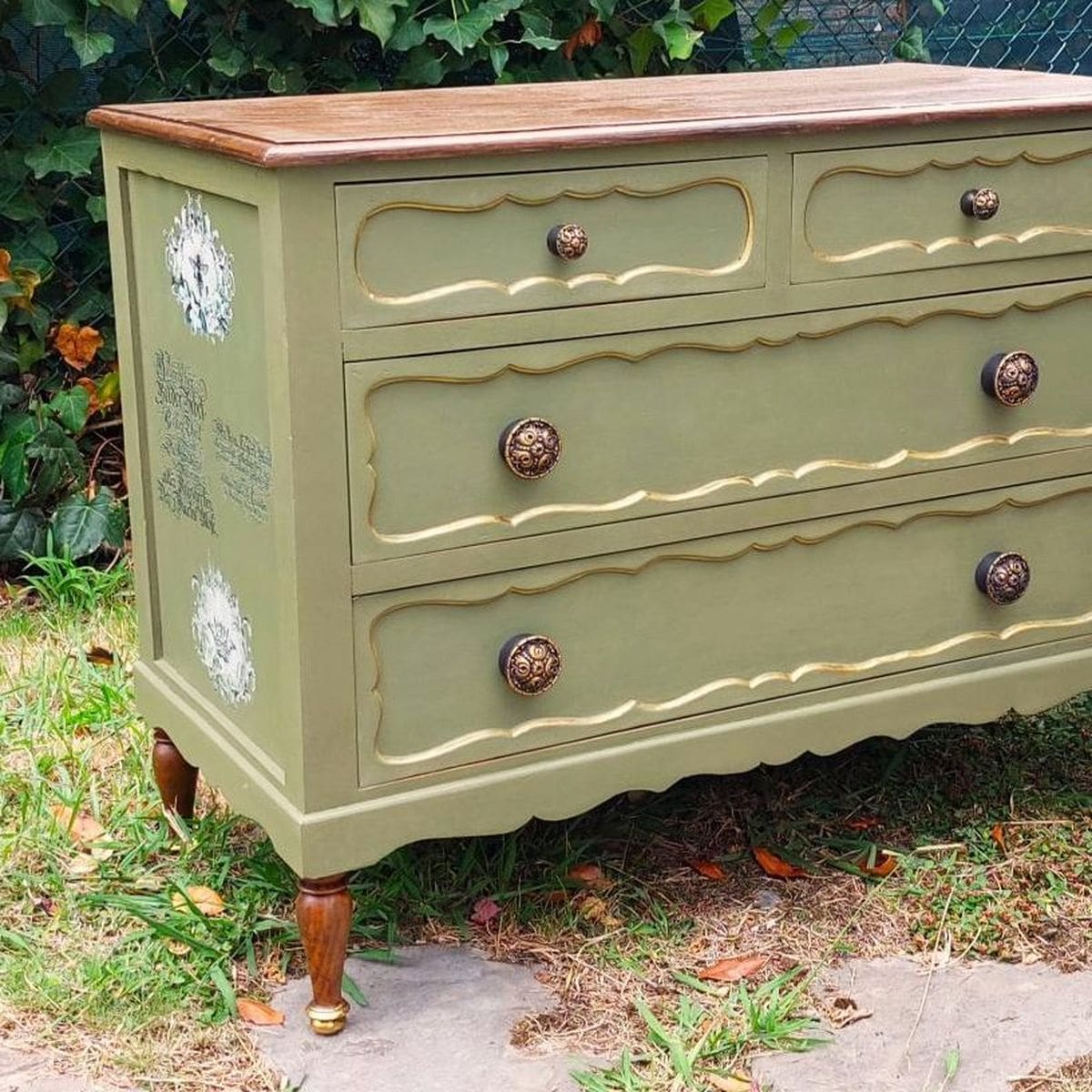 Esta hermosa cómoda ha sido transformada con mucho amor y chalk paint para darle un toque fresco y elegante. Con transferencias, detalles dorados y un acabado verde oliva que resalta su encanto vintage.