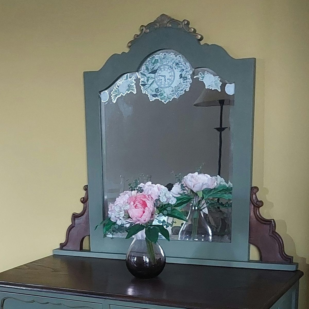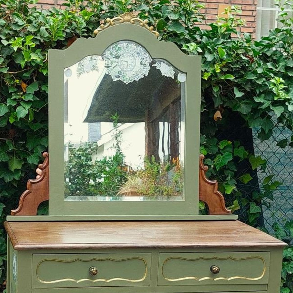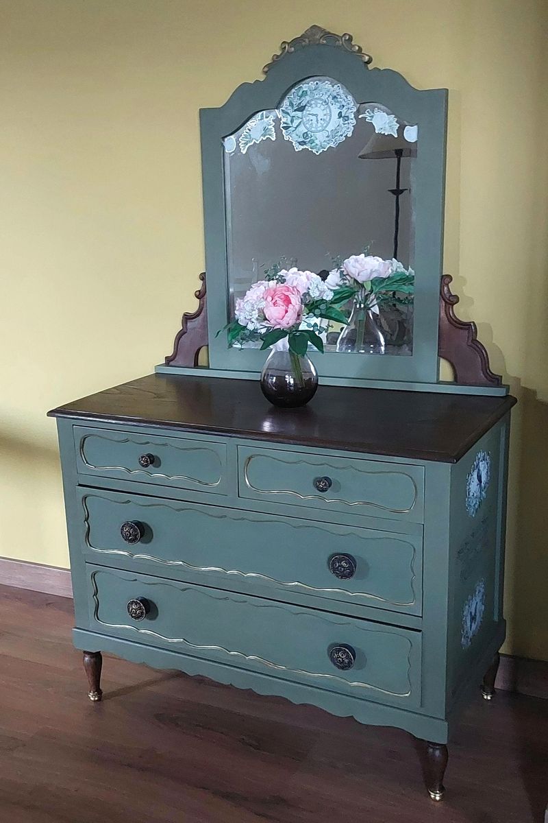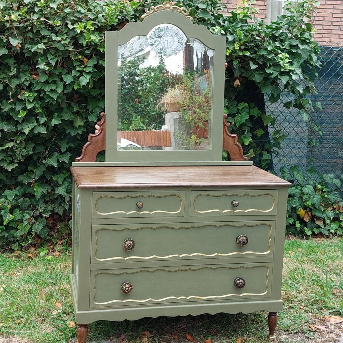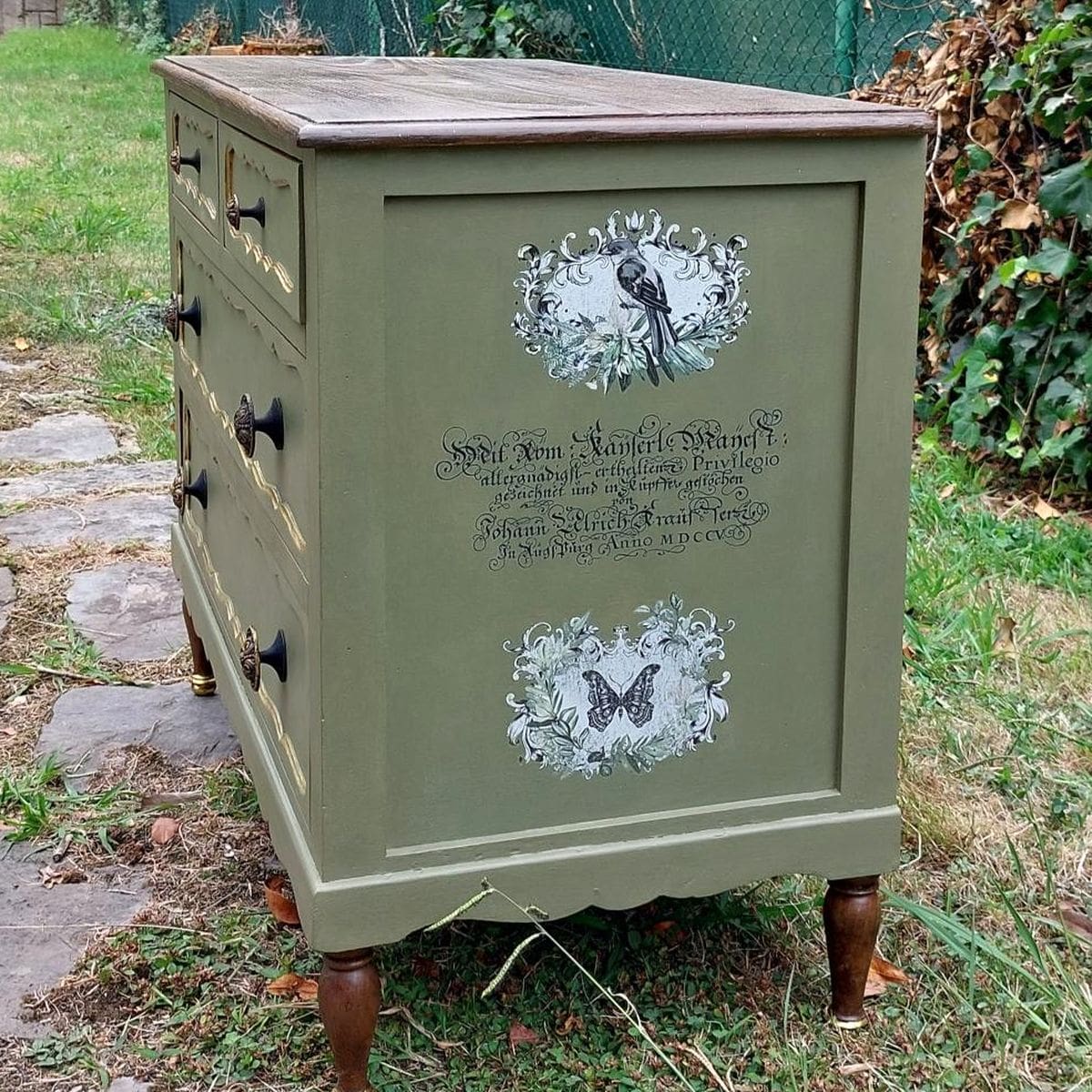 Esta hermosa cómoda ha sido transformada con mucho amor y chalk paint para darle un toque fresco y elegante. Con transferencias, detalles dorados y un acabado verde oliva que resalta su encanto vintage.