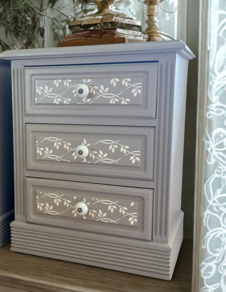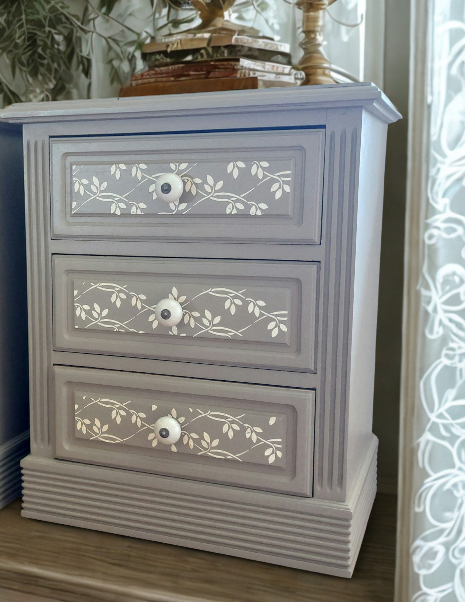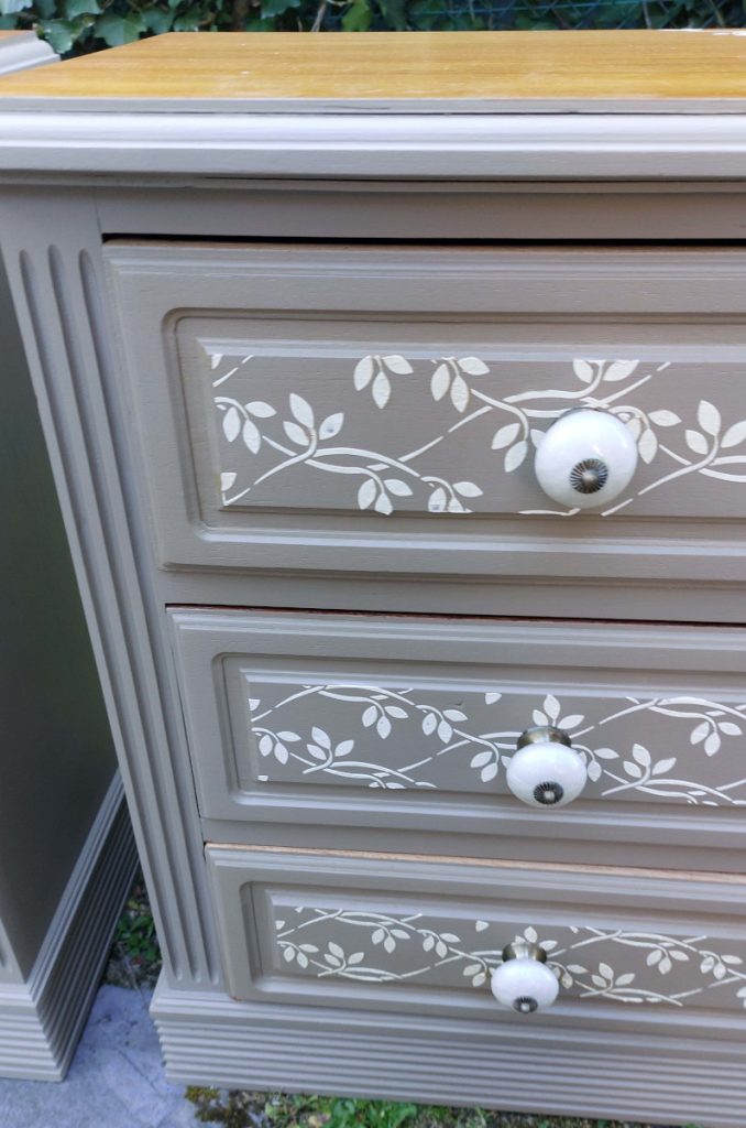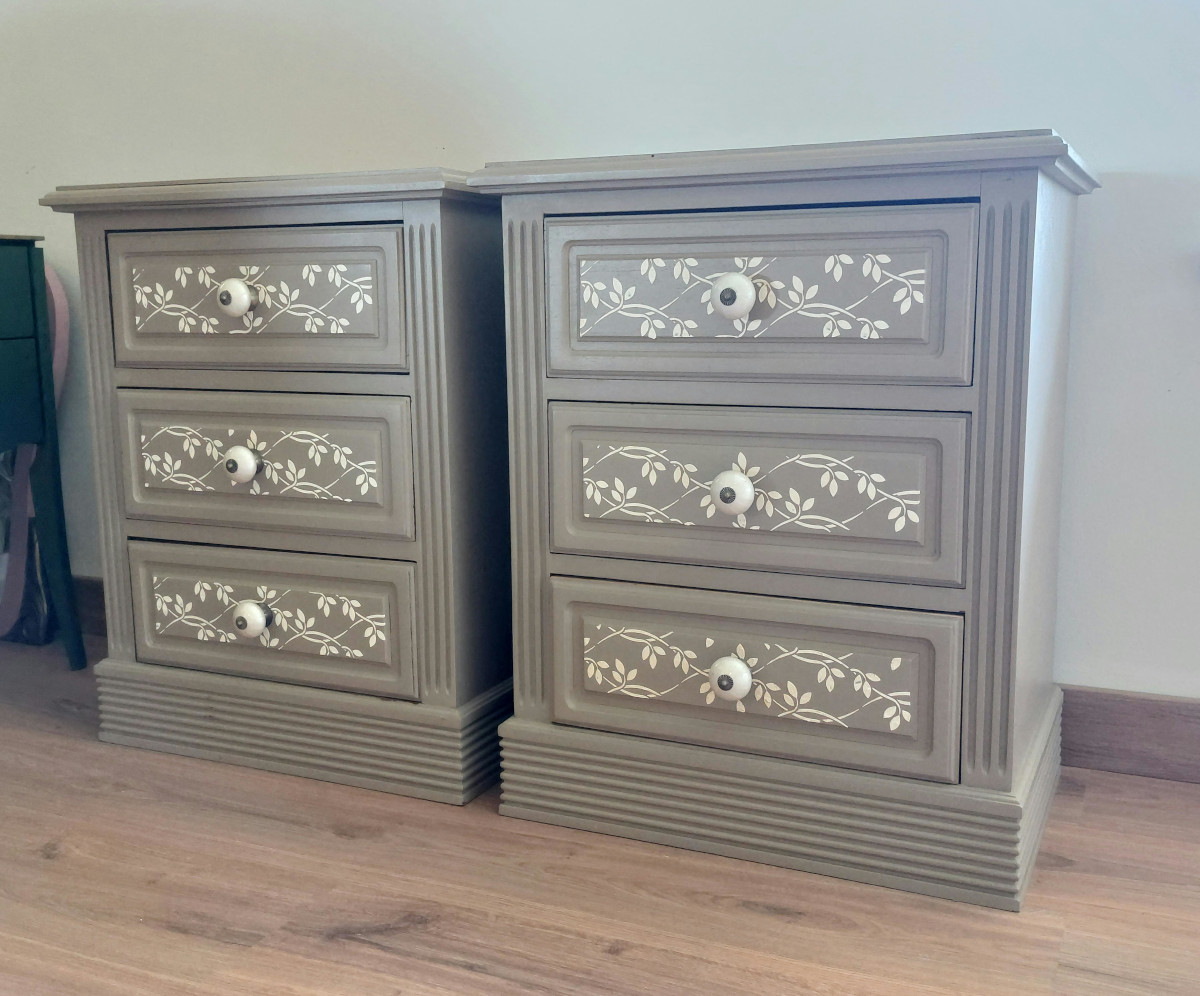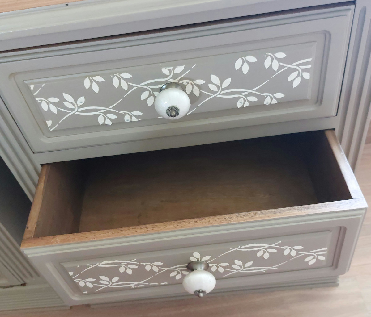 Pintadas con pintura mineral de alta calidad, se han trabajado con un delicado esténcil en relieve, que aporta textura y elegancia al frente de los cajones. Incorporan pomos de cerámica artesanal, que acentúan su aire romántico y refinado. Todo el conjunto ha sido protegido con barniz y cera natural, garantizando durabilidad y un acabado sedoso.